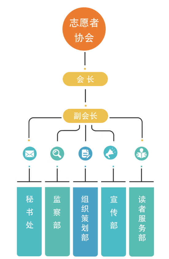 图书馆志愿者协会实行会长负责制,会长、副会长由竞聘产生,负责全面管理协会的日常工作。综合办公室为本馆志愿者组织管理的主要部门,负责志愿者的招募、管理、活动组织等工作。
